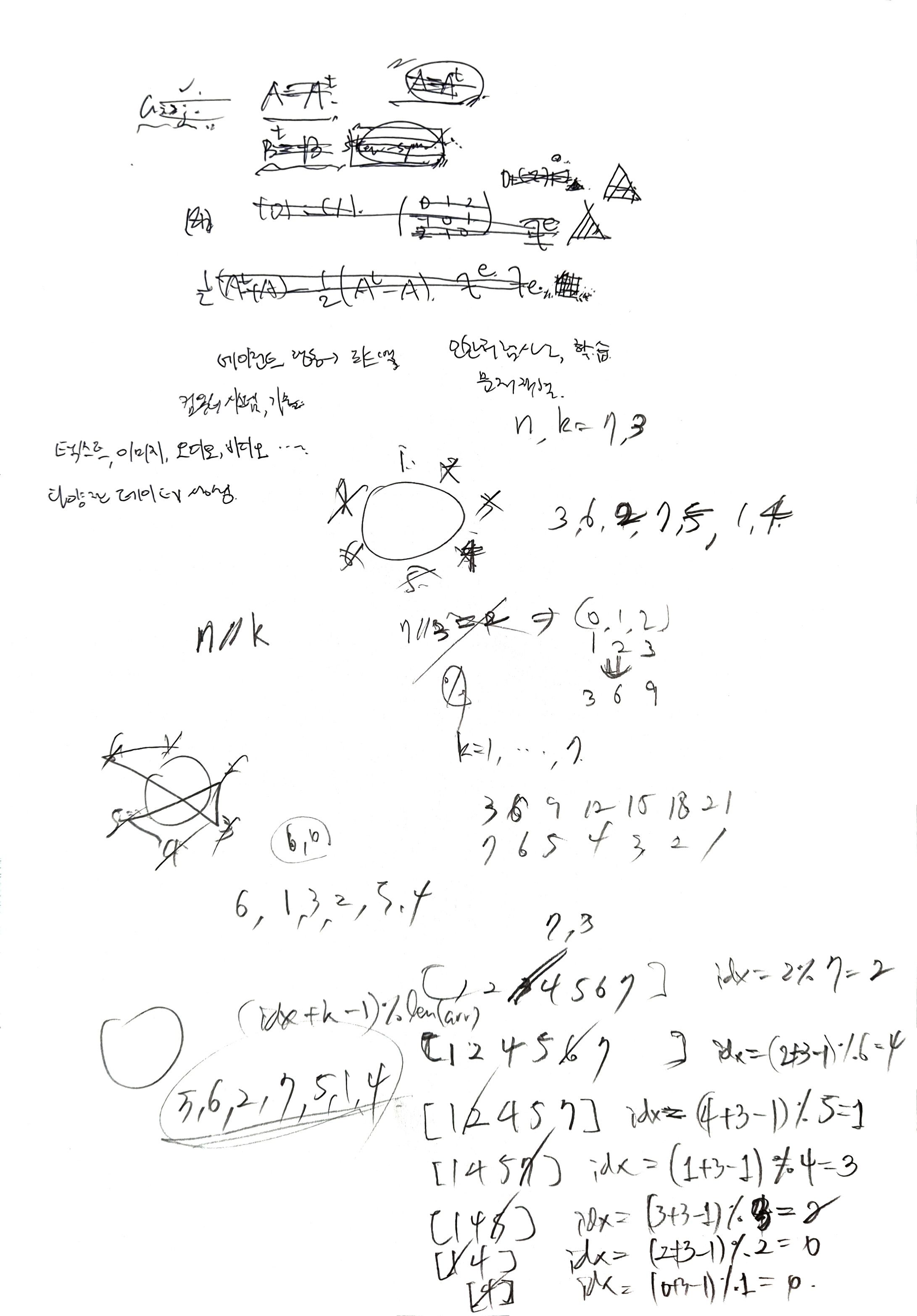 1. Problem Linkhttps://www.acmicpc.net/problem/1158 2. Solution Coden, k = map(int, input().split())arr = list(range(1, n + 1))result = []index = 0for _ in range(n): index = (index + k - 1) % len(arr) result.append(arr.pop(index))print(f"{', '.join(map(str, result))}>") 3. Reasoning 실은 첫 시도를 리스트의 k-1번째 인덱스를 기준으로 슬라이싱을 하여 뒤로 붙이는 방법으로 하려고 했으나, n이 5000까지 주어진 것을 보고 직관적으로 시간초과를 마주하게 될 것이라 생각하여 ..
